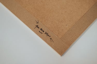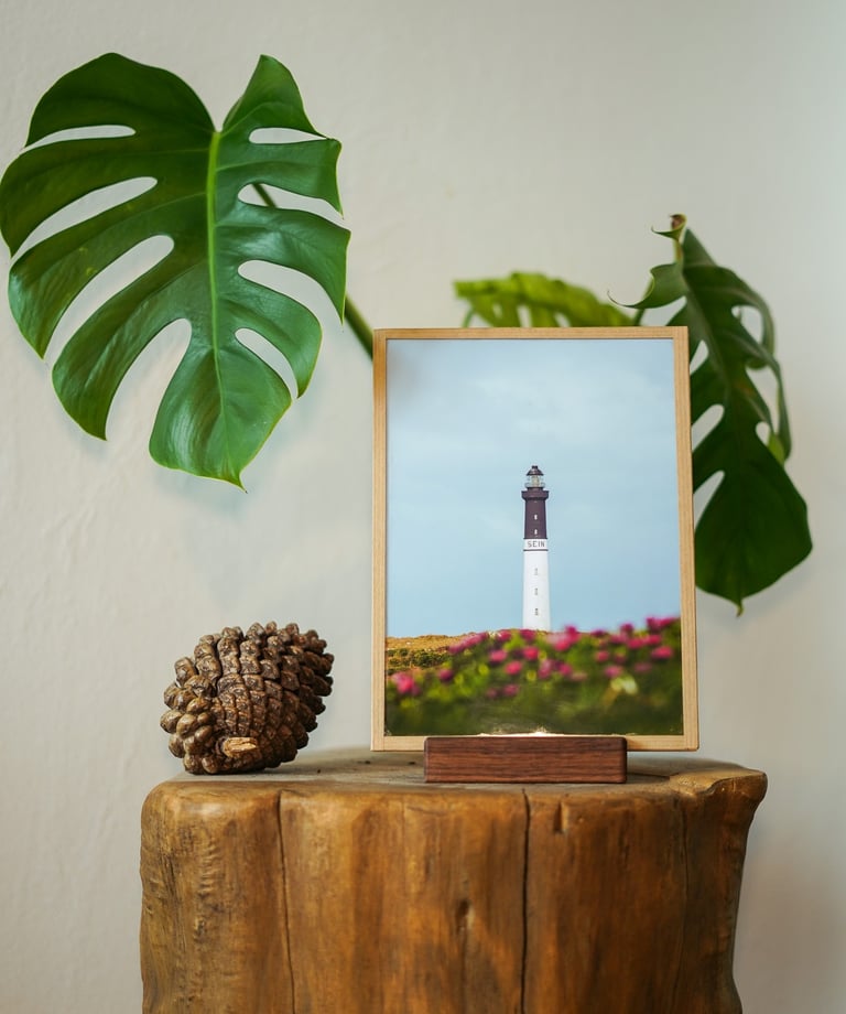Les photos reposent sur une plaque et un socle en bois. Le bois utilisé provient exclusivement des chutes de bois non utilisées de la menuiserie charpente Mikabois située à Pont-Croix. Les autres matériaux utilisés pour la réalisation de ces encadrements viennent tous du Finistère Sud.